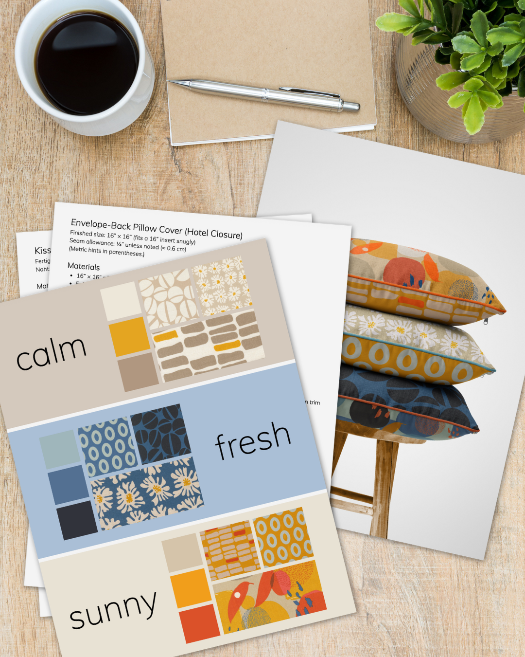 Chic Pillow (16" x 16"). Front: hero print; Flange or binding: pop color; Back: calm neutral. DOWNLOAD YOUR FREE STARTER PACK WITH PILLOW SEWING INSTRUCTIONS HERE